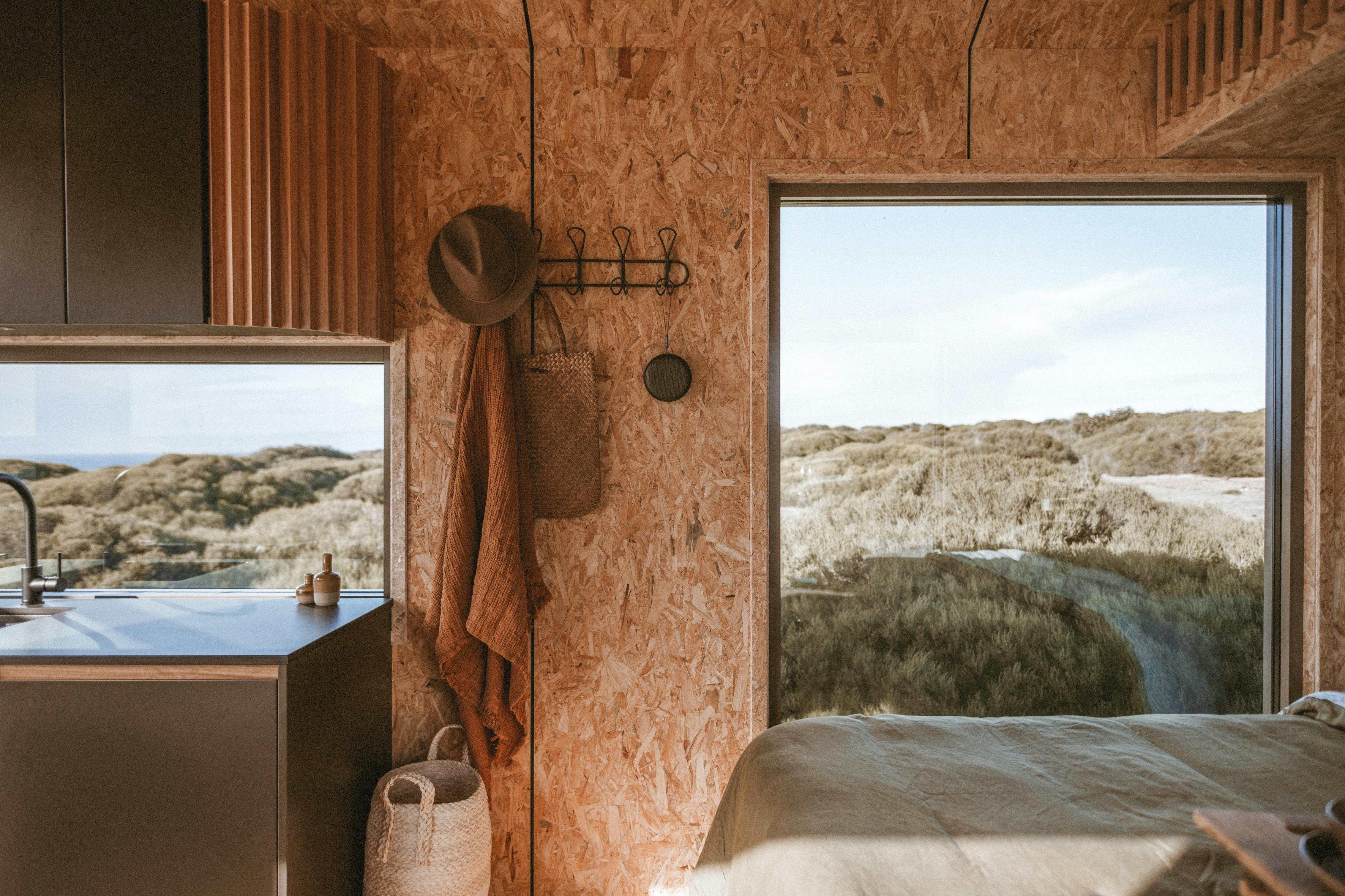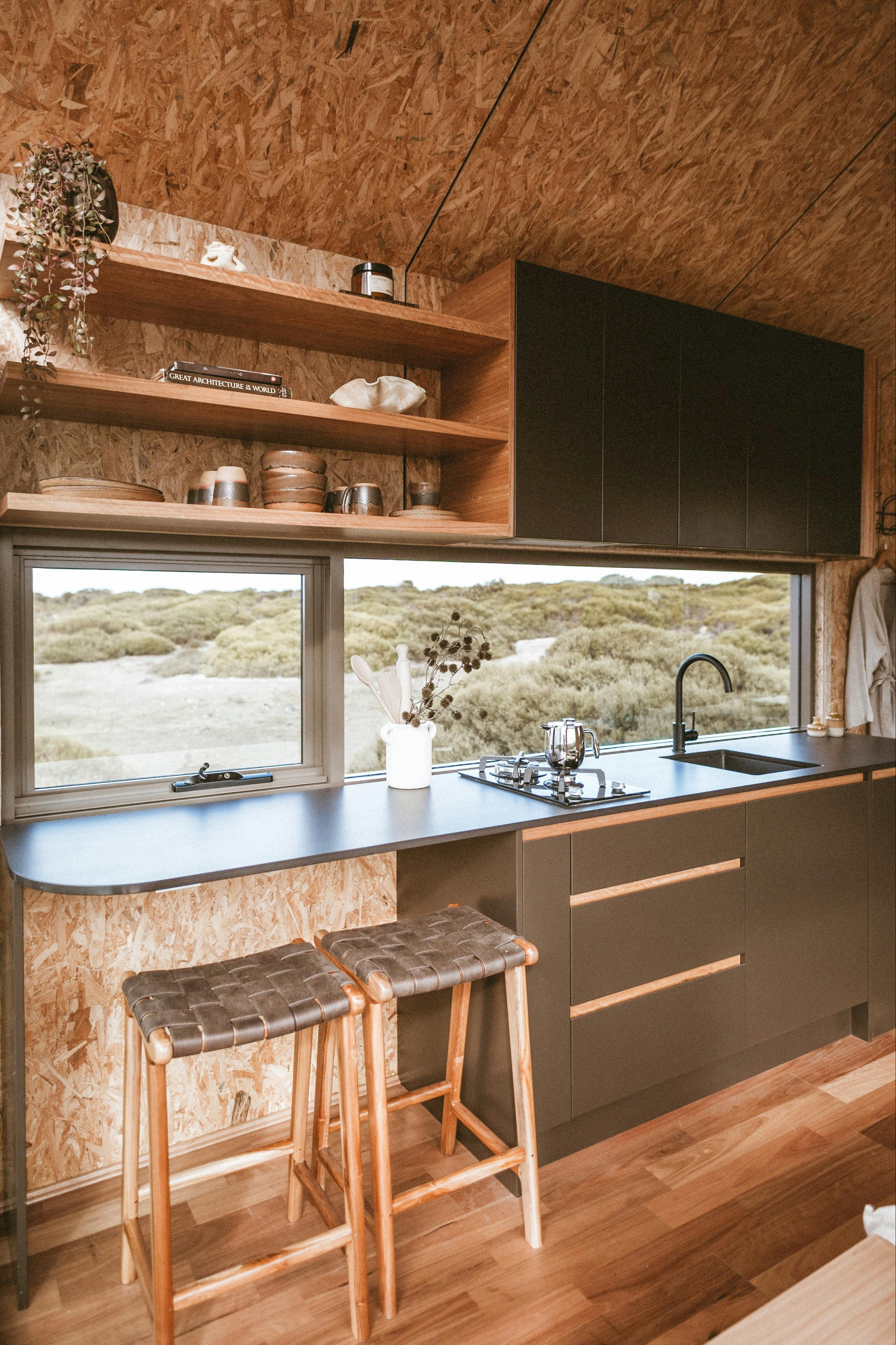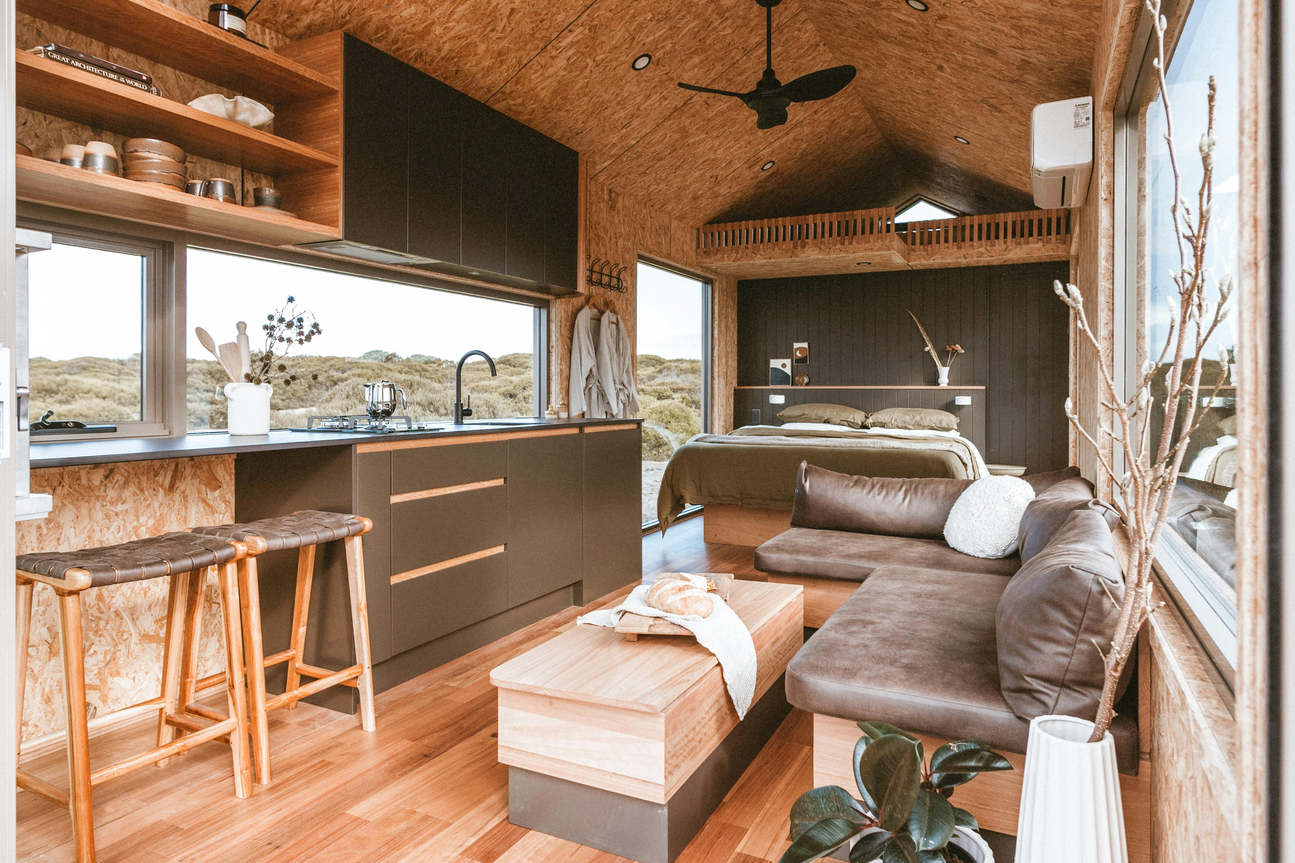 Your Tiny Abode includes a double shower, flushing toilet and handpicked limestone tiles sourced from Turkey by Tiles of Ezra, celebrating the sustainability of craftsmanship. The well-appointed kitchen has a bar fridge, two-burner gas cooktop, full-sized sink and all the utensils and equipment you’ll need for your stay, as well as a stone-top breakfast bar with panoramic views.