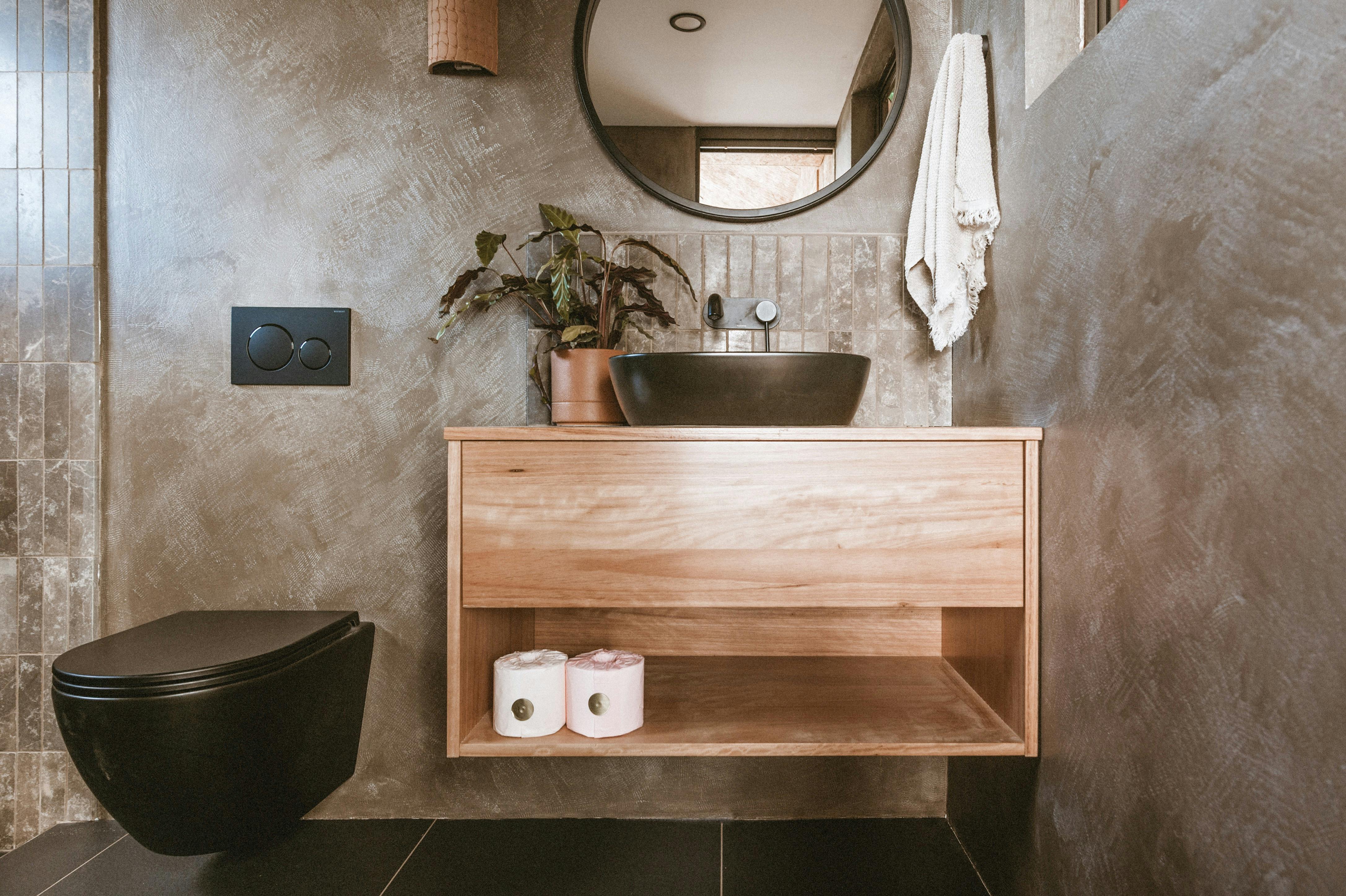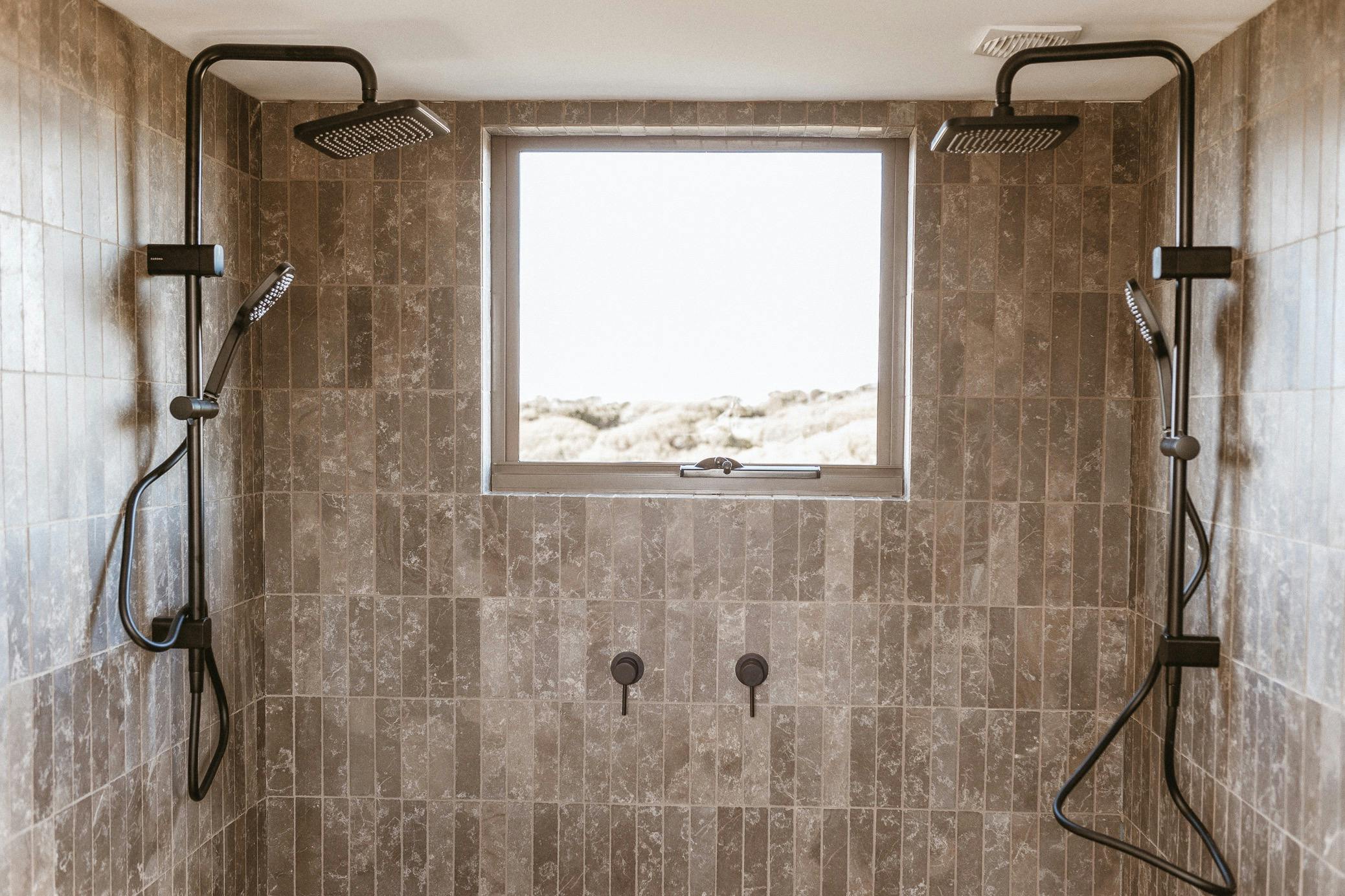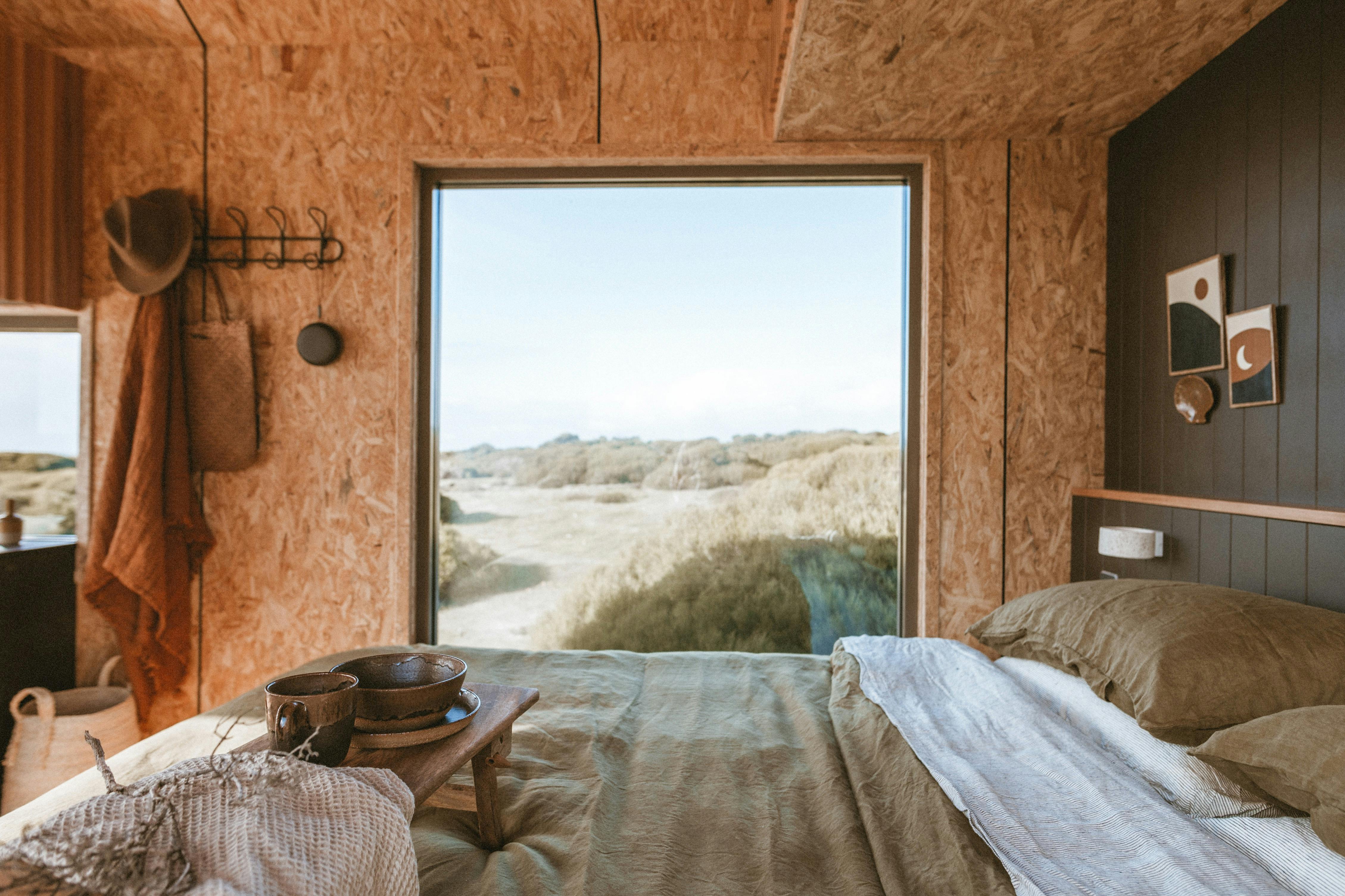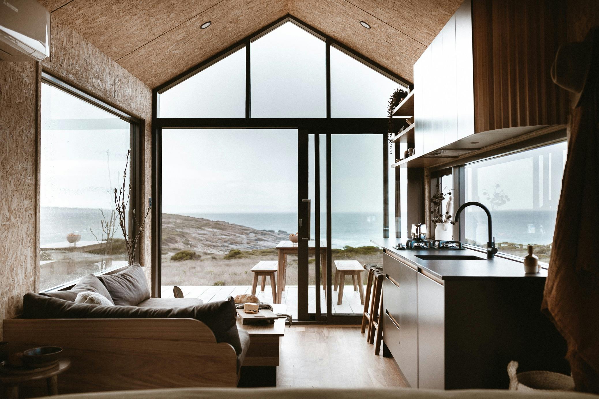 Your Tiny Abode includes a double shower, flushing toilet and handpicked limestone tiles sourced from Turkey by Tiles of Ezra, celebrating the sustainability of craftsmanship. The well-appointed kitchen has a bar fridge, two-burner gas cooktop, full-sized sink and all the utensils and equipment you’ll need for your stay, as well as a stone-top breakfast bar with panoramic views.