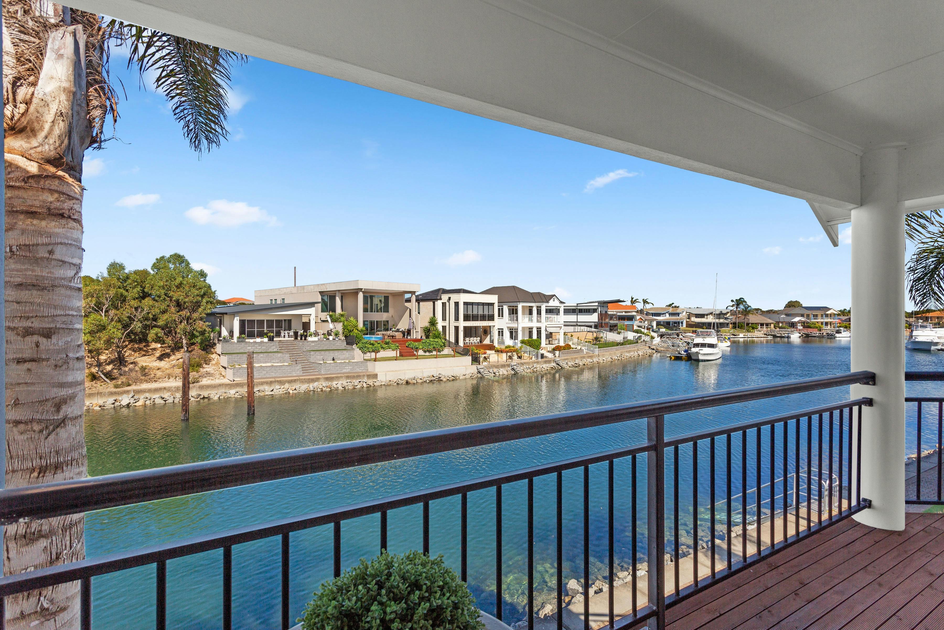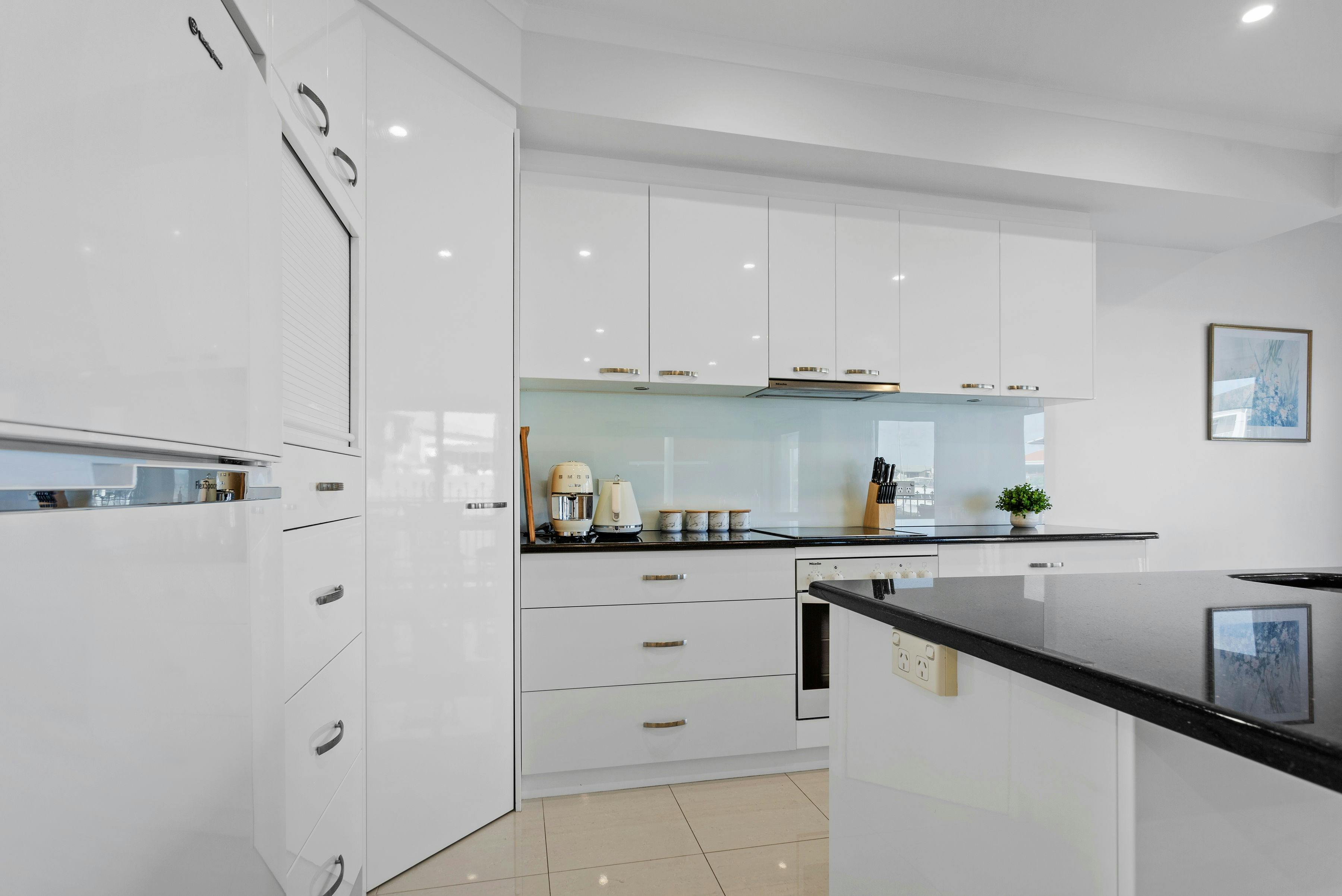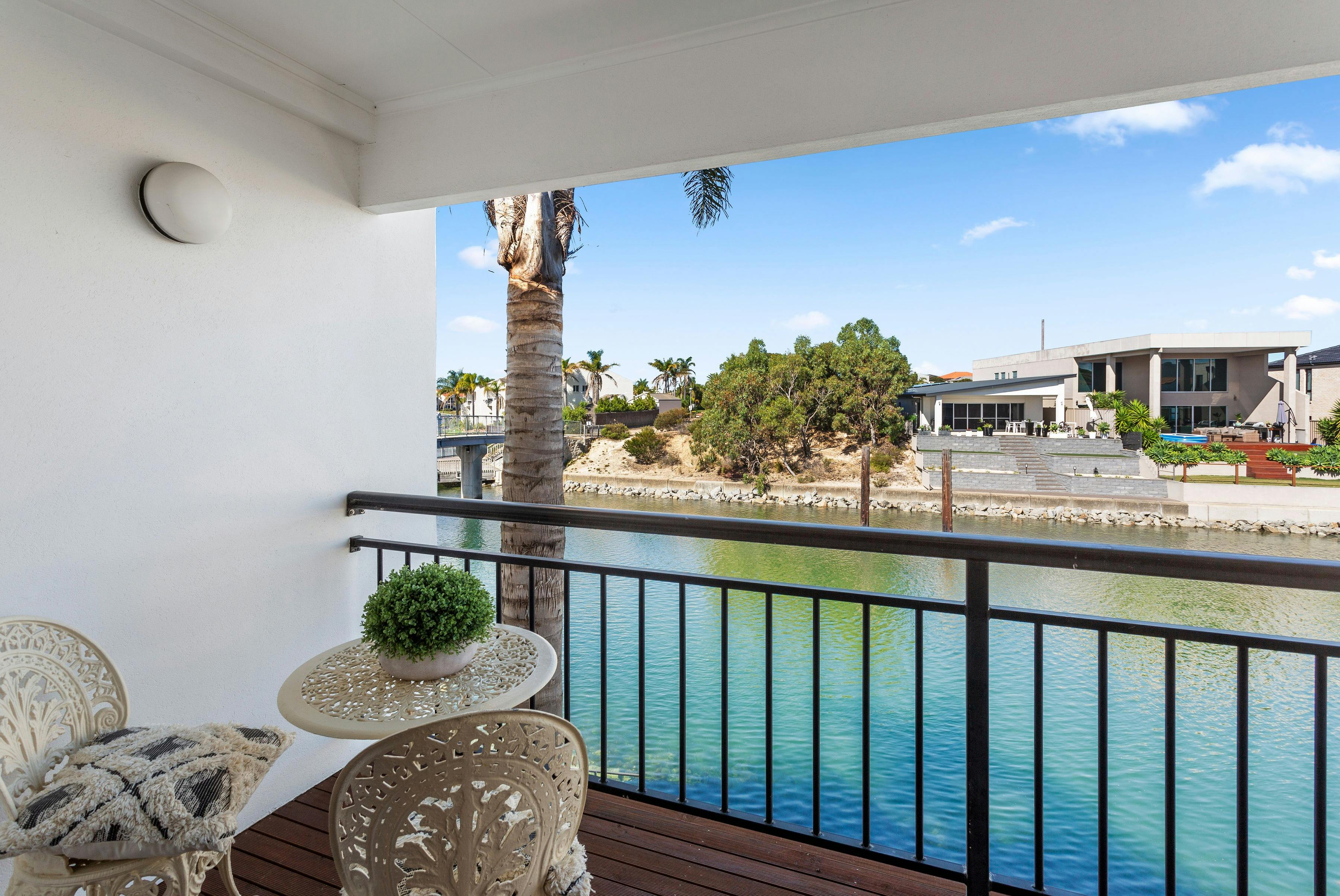Bedroom one has a queen-size bed with an en-suite, which has a bath and double shower. Bedroom two has a queen-size bed and both have access to a balcony overlooking the water. Bedroom three has two king-single beds.