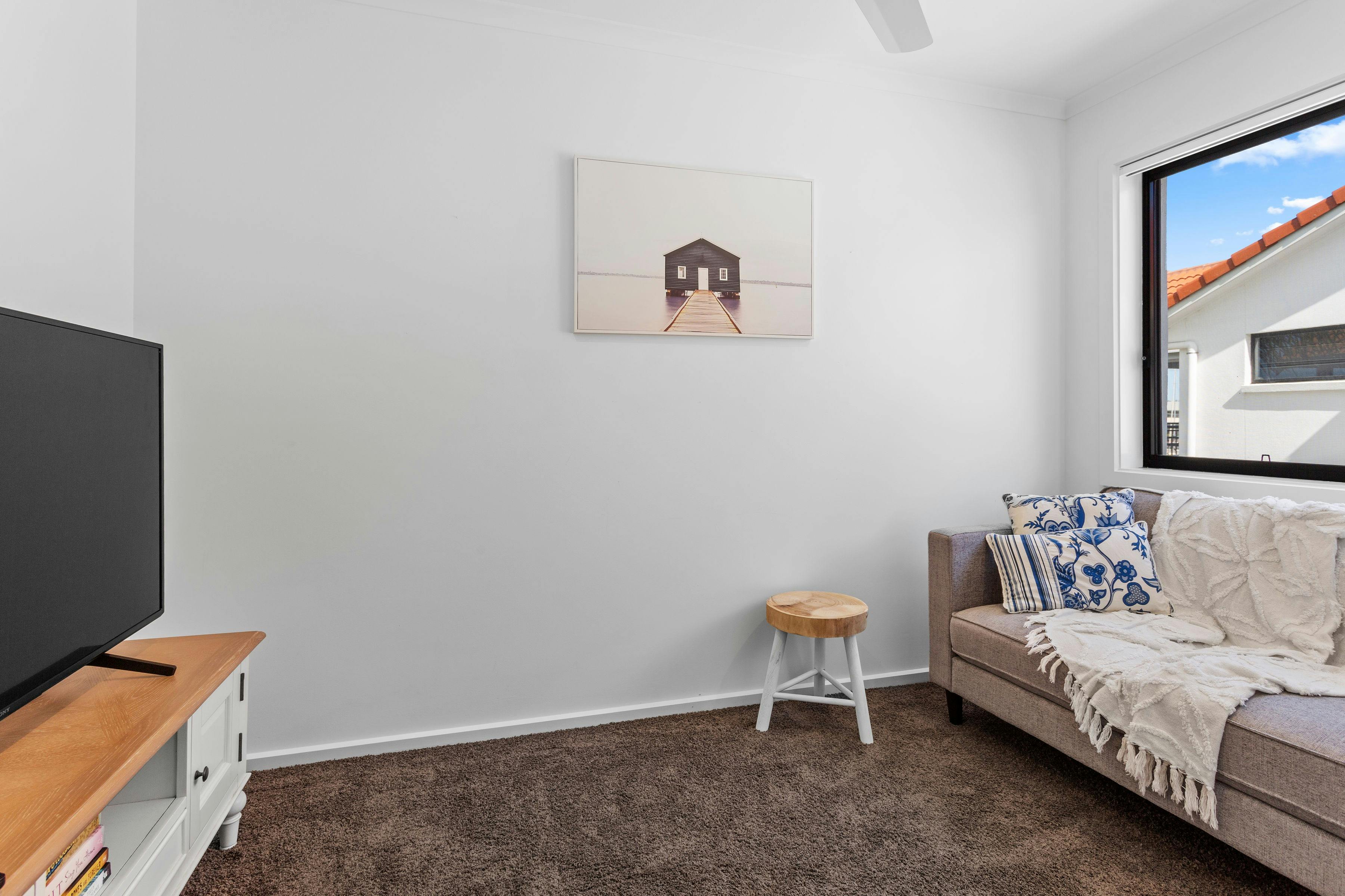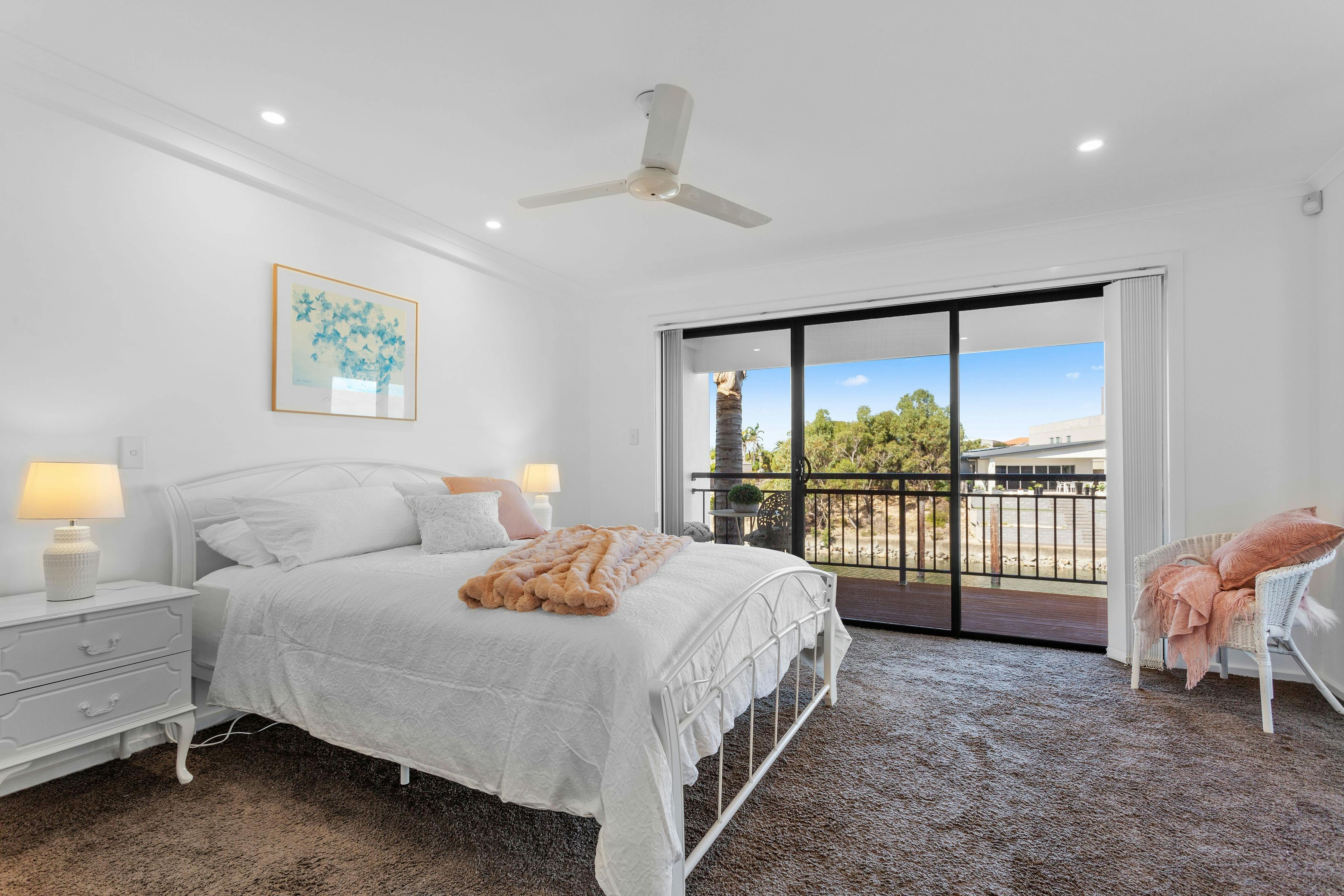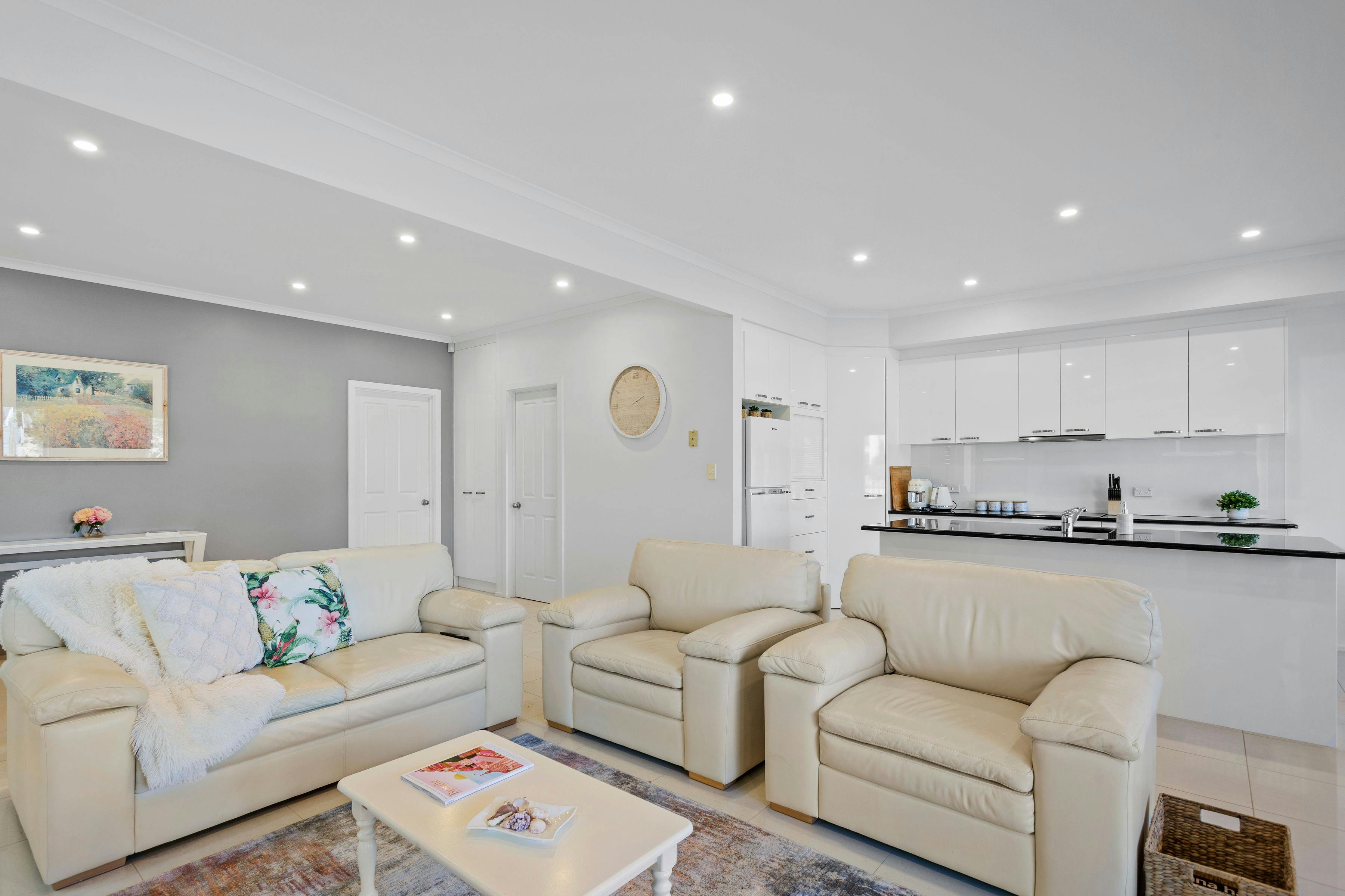 Bedroom one has a queen-size bed with an en-suite, which has a bath and double shower. Bedroom two has a queen-size bed and both have access to a balcony overlooking the water. Bedroom three has two king-single beds.
