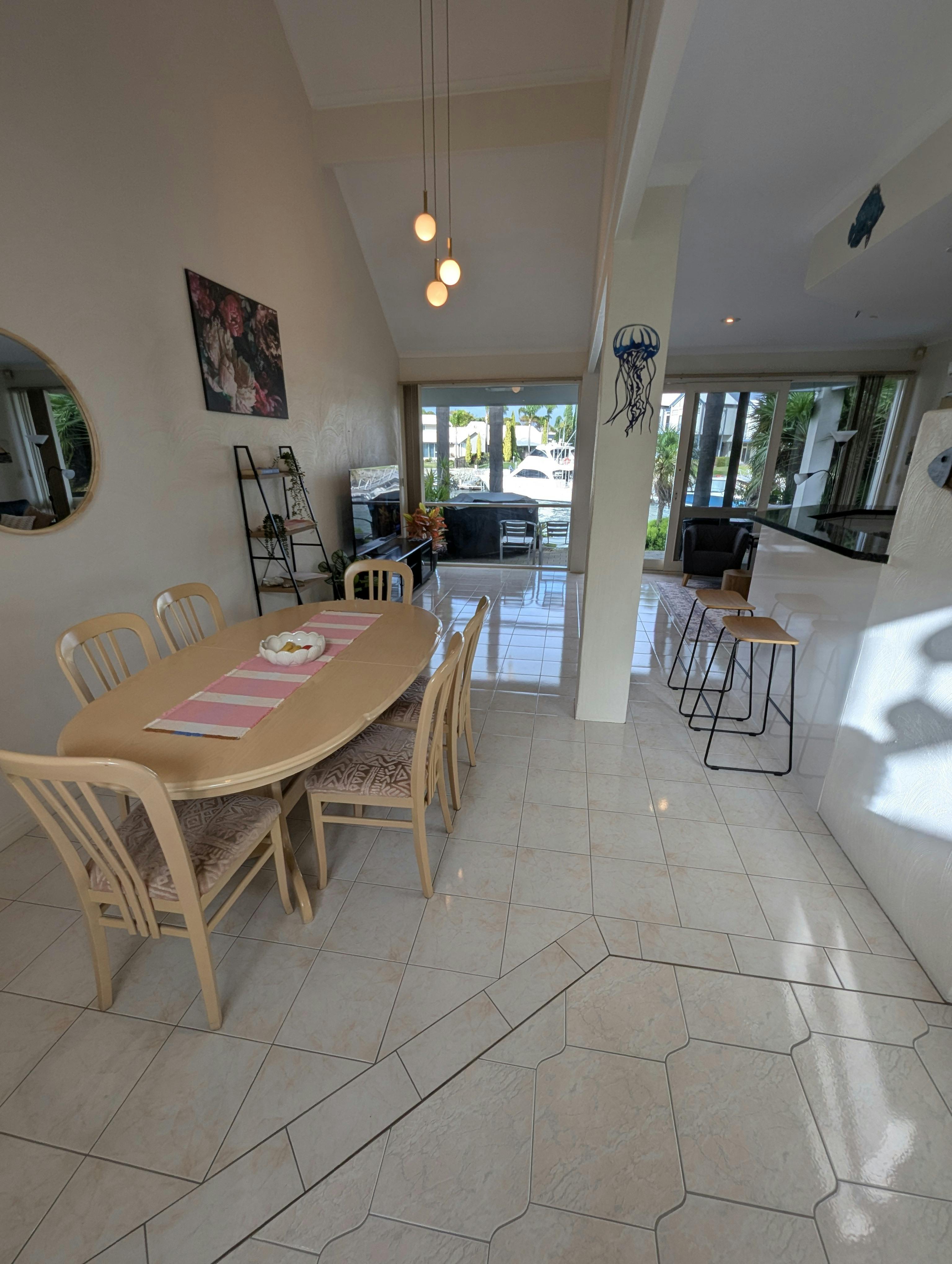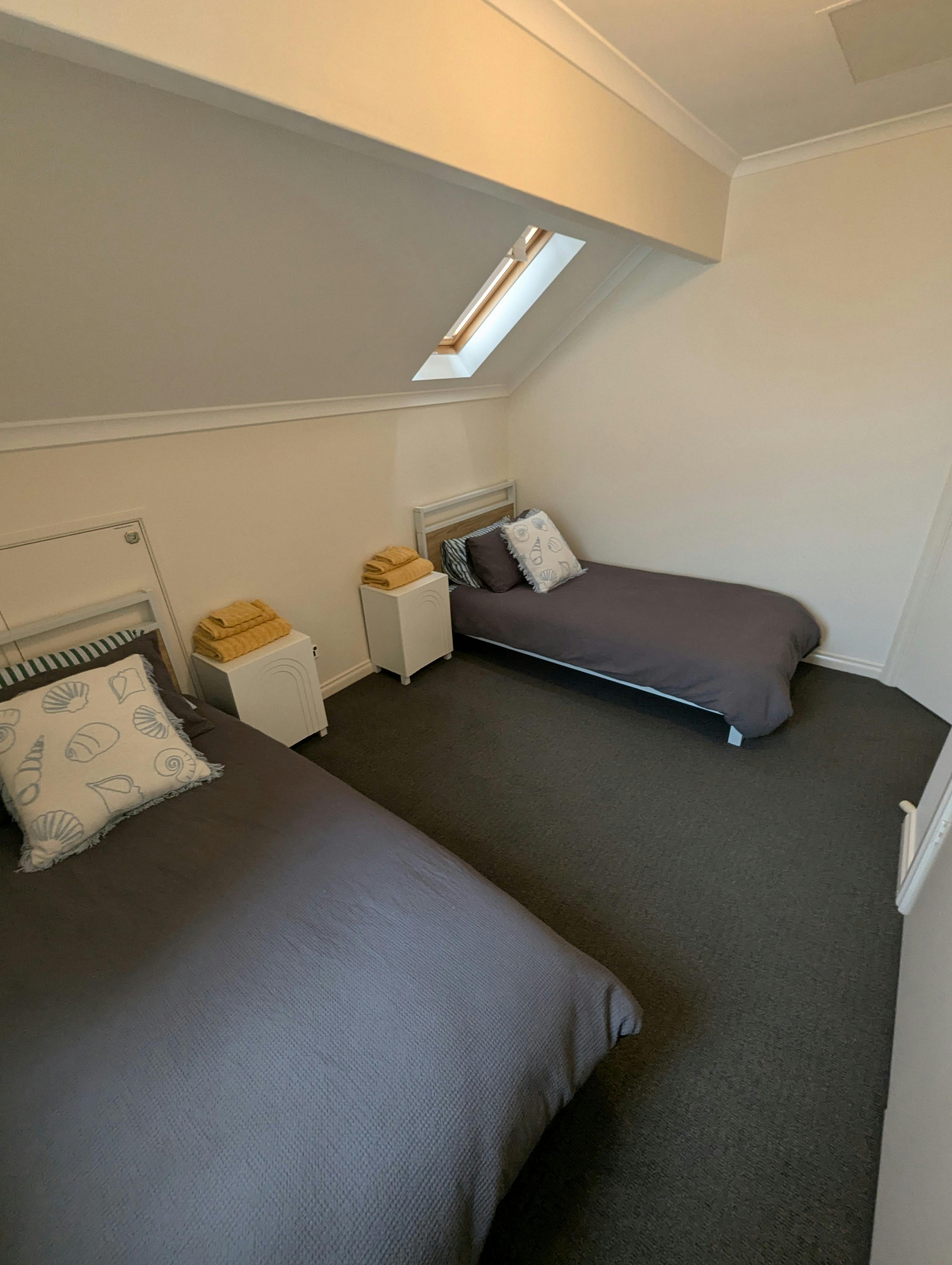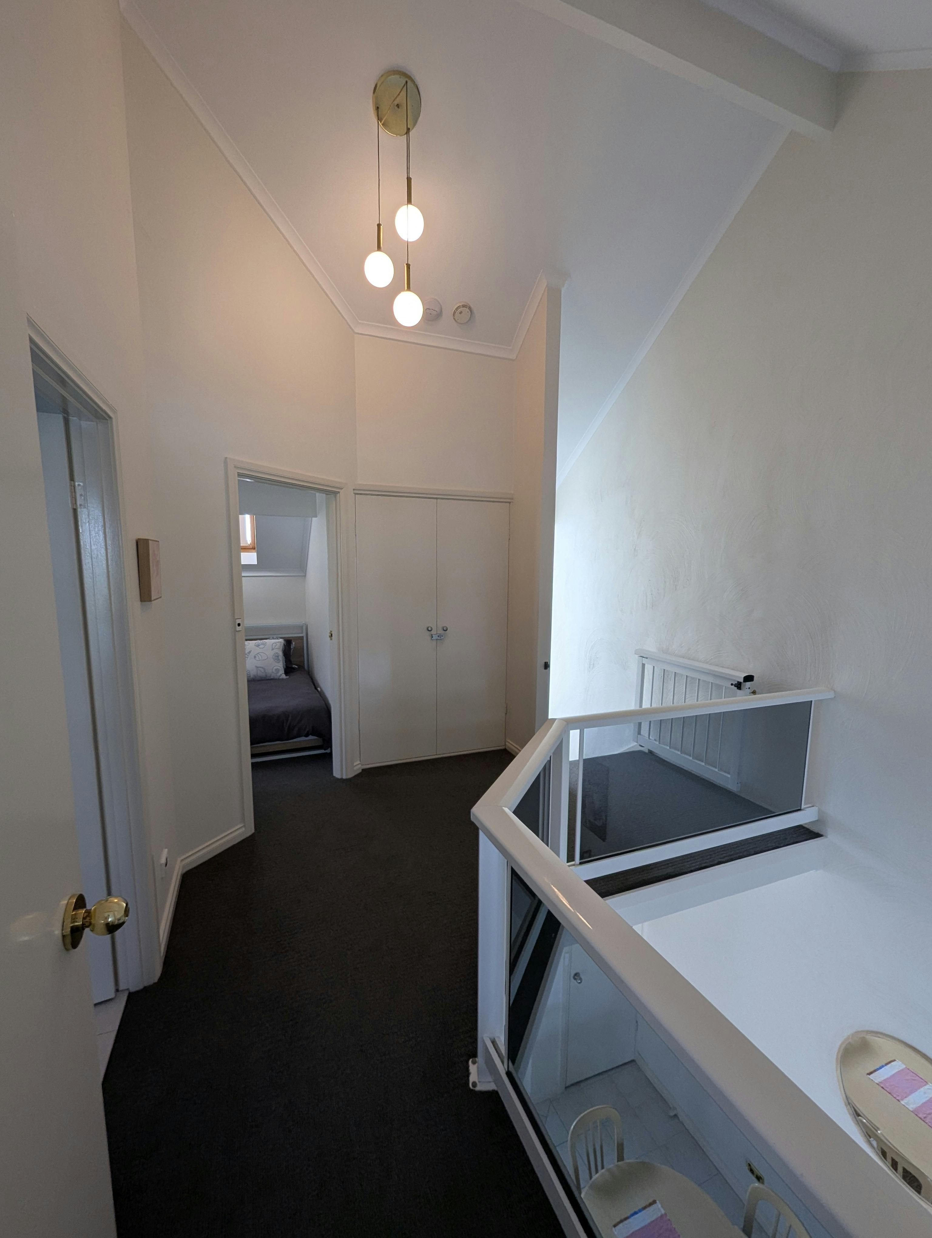2 level modern townhouse with an open plan kitchen, dining & living, with a family bathroom & queen bedroom downstairs, upstairs has a main room with Queen bed 2 way bathroom. Third bedroom has 2 single beds perfect for children.