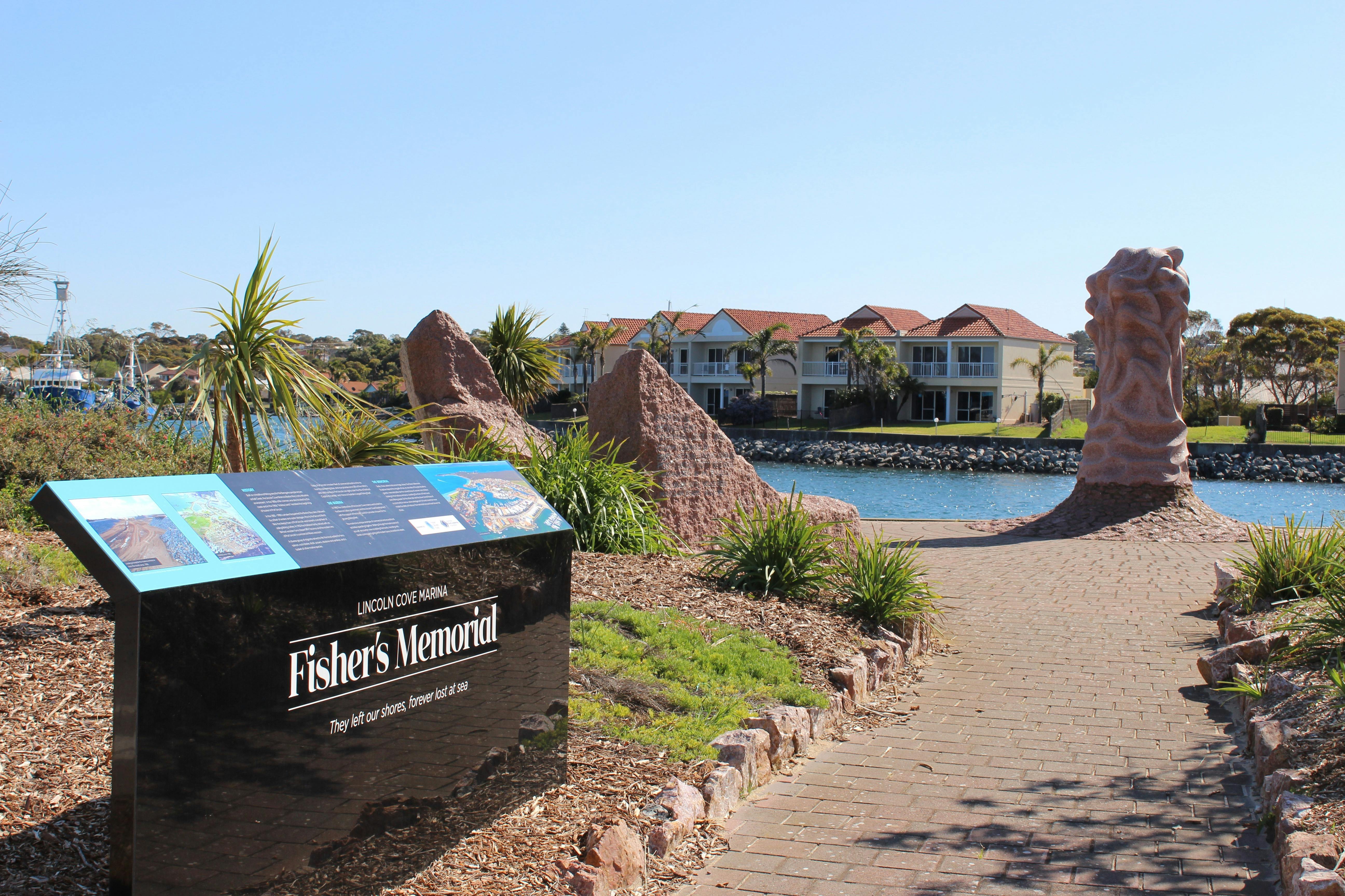 The landward side shows the downward faces of women in sorrow knowing they will never see their love ones again. Surrounding the central monument lay scattered stones with the individual names of some 50 men and their boats that have departed from Port Lincoln never to return. On average one name is added to the granite stones each year.