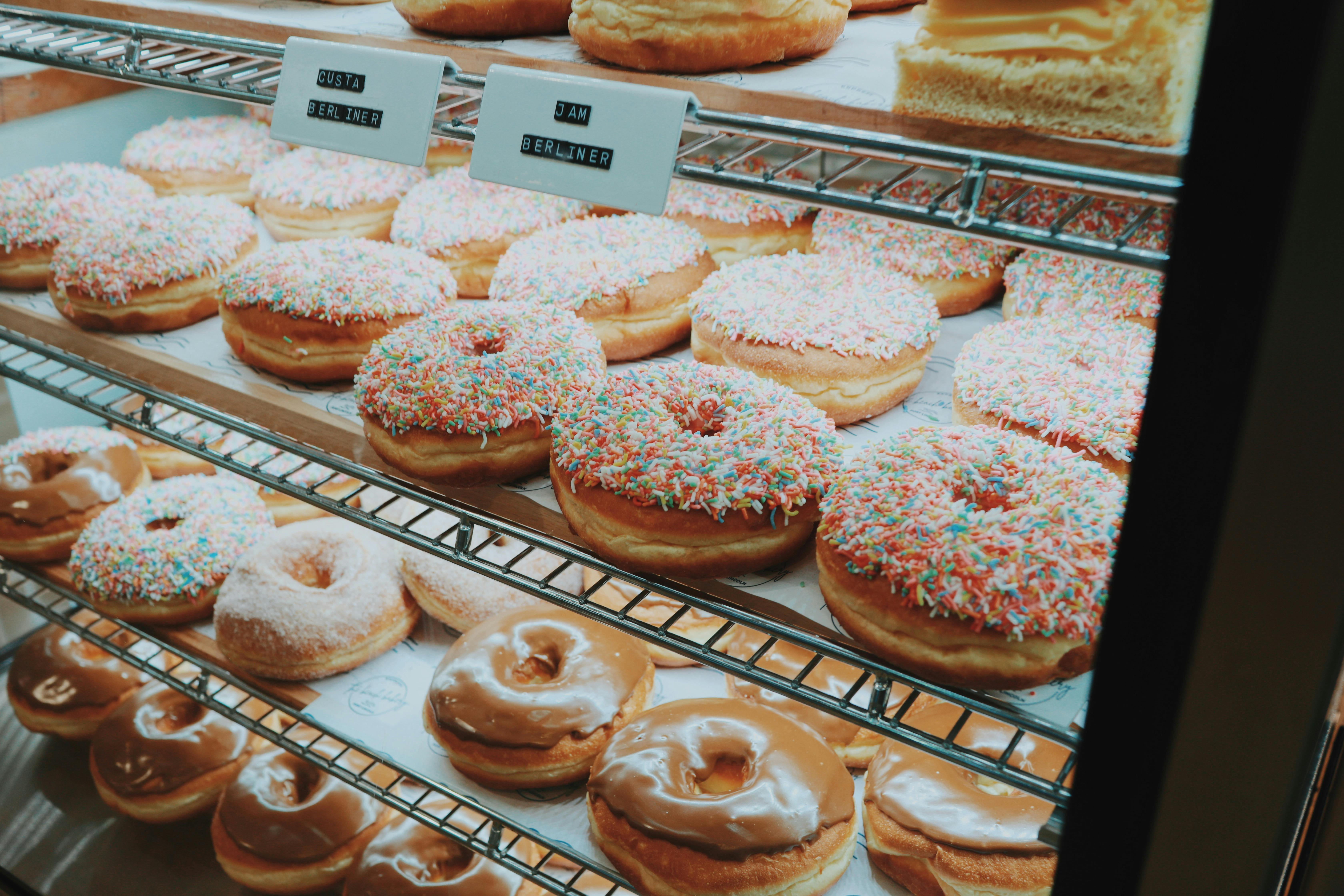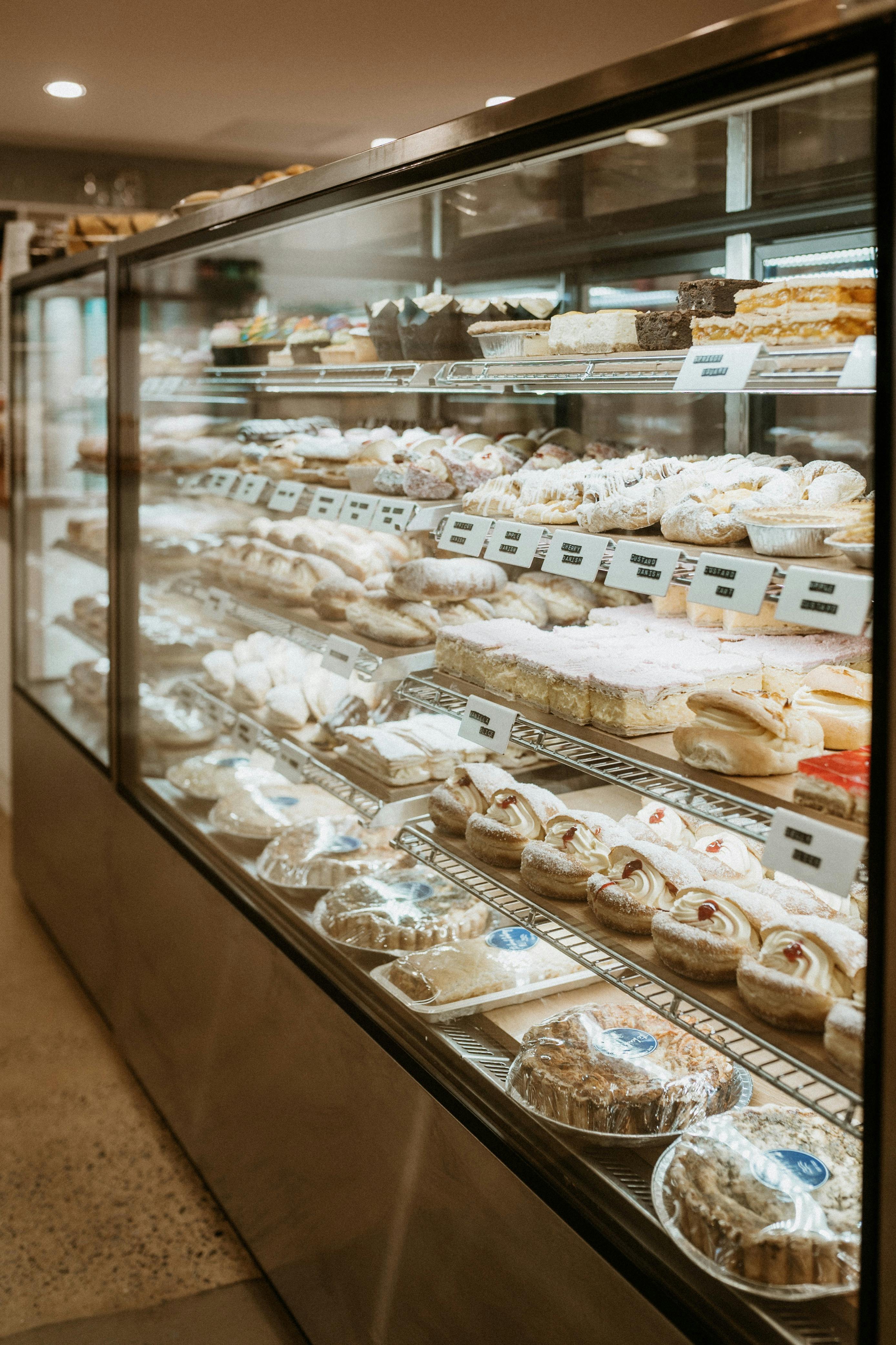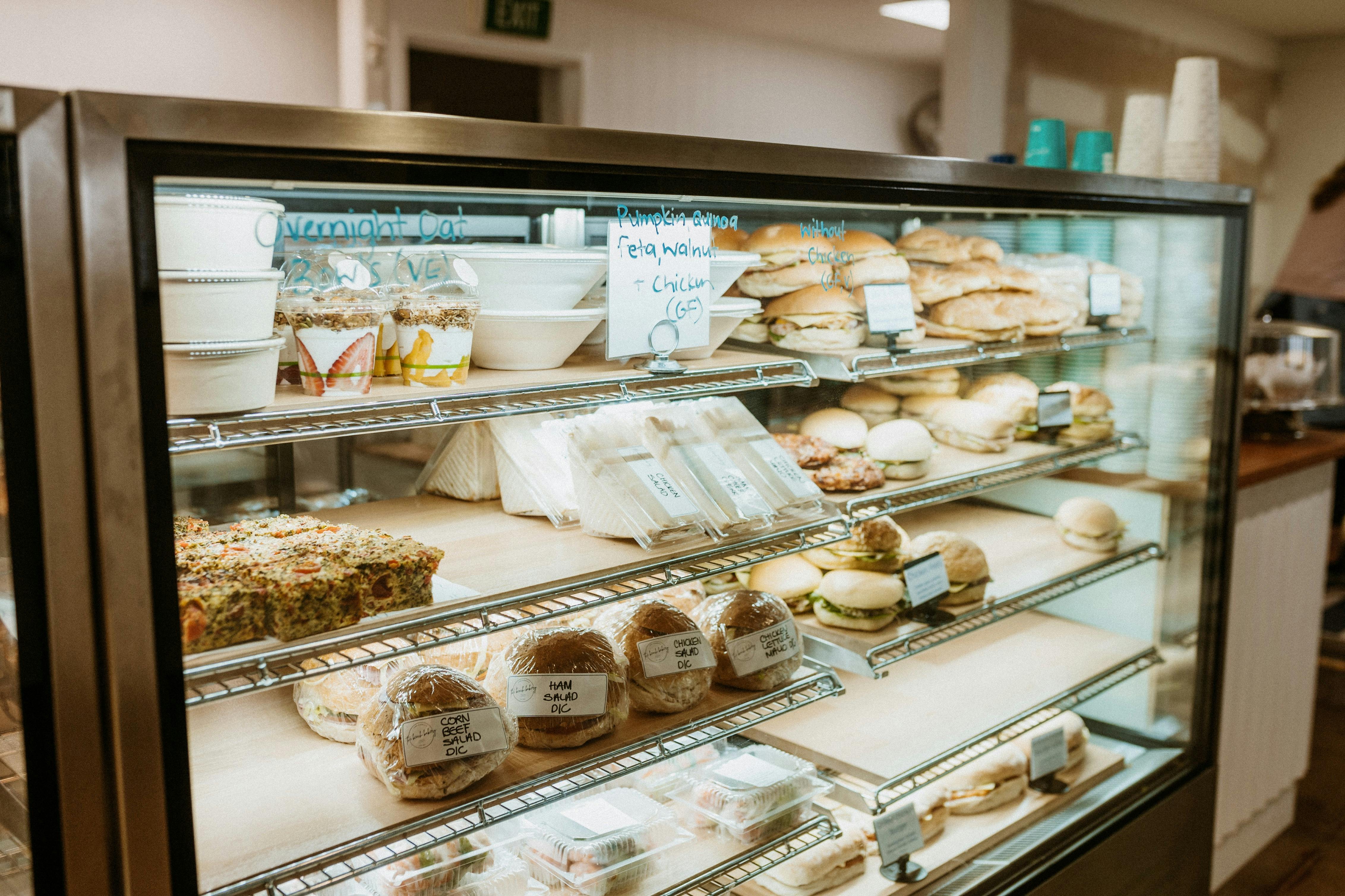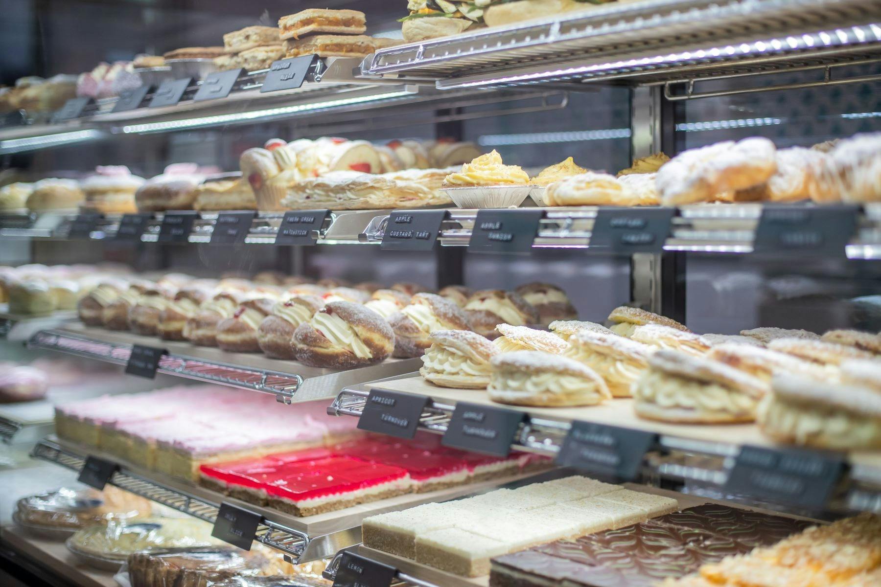 The menu features a large selection of handmade pastries, with more than thirty options baked daily. Guests can choose from a wide variety of sweets, sandwiches, toasted bagels and breakfast favourites including bacon and egg rolls, wraps and muffins. Freshly made coffee is available throughout the day.